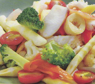 Nguyên liệu: - 100gr măng trúc, thái khúc. - 150gr cải trắng, xanh, cắt miếng. - 1/2 củ cà rốt bào sợi. - 5 quả cà chua bi, bổ đôi. - 100gr măng vàng, cắt khúc. - 1/2 củ hành tây, cắt múi. - 100gr tôm lột vỏ, chẻ lưng. - 50gr mực, khứa vảy rồng. - 50gr phi lê cá chẽm, cắt miếng. - Gia vị: Bột nêm, dầu hào, dầu ăn, 2 thìa cà phê bột năng pha loãng, 1 thìa súp tỏi xay, nước dùng.